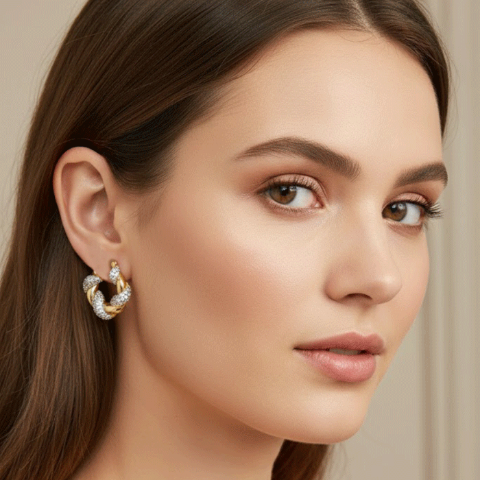 Argollas Trenzadas Bañadas en Oro y Oro Blanco con Brillo de Circones
