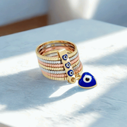Anillo “7 Tratados” con Ojo Turco y dije en forma de corazón, bañado en 3 oros. Elegancia, protección y estilo en una sola joya.
