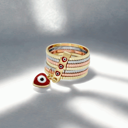 Anillo en tres tonos con dije de corazón rojo de Ojo Turco “7 Tratados”, bañado en oro. Un amuleto protector y elegante para tu día a día.