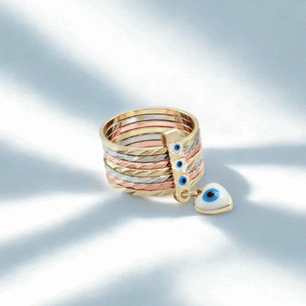 Anillo de Ojo Turco “7 Tratados” bañado en 3 oros con dije en forma de corazón. Elegancia, protección y diseño moderno en una sola pieza.