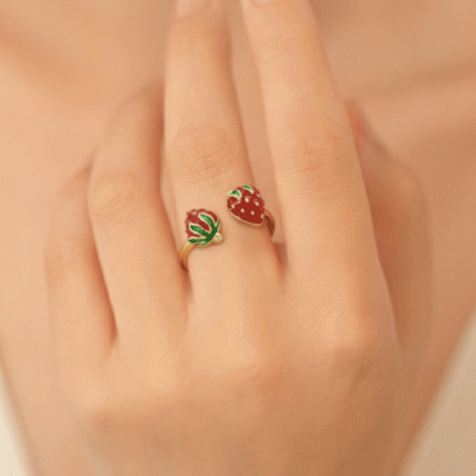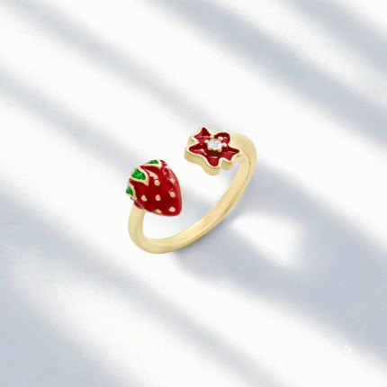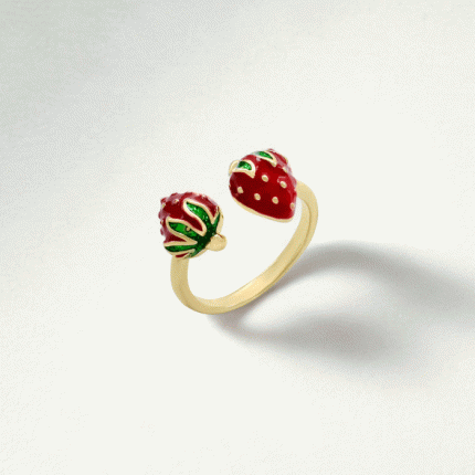 Anillo ajustable bañado en oro con diseño de fresa esmaltada, perfecto para dar un toque tierno y vibrante a tu estilo.
