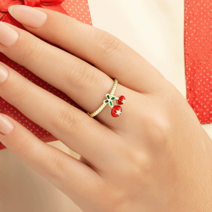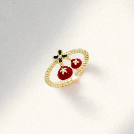 Anillo ajustable bañado en oro con diseño de cerezas rojas y hojas verdes, un toque juvenil y elegante que combina con cualquier estilo.