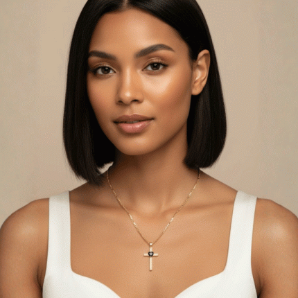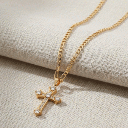 Cadena de bolitas bañada en oro con un dije de cruz engastado con cinco brillantes circones. Una pieza de joyería religiosa moderna, elegante y llena de significado.