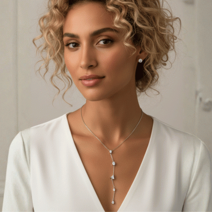 Juego de collar y aretes bañados en plata con cristales brillantes. Elegancia atemporal para iluminar tus momentos más especiales.