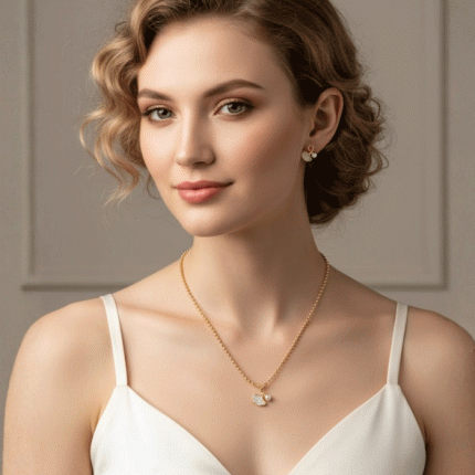 Juego de cadena, dije y aretes bañados en oro con diseño de lazo y perla. Delicadeza y elegancia en cada detalle.