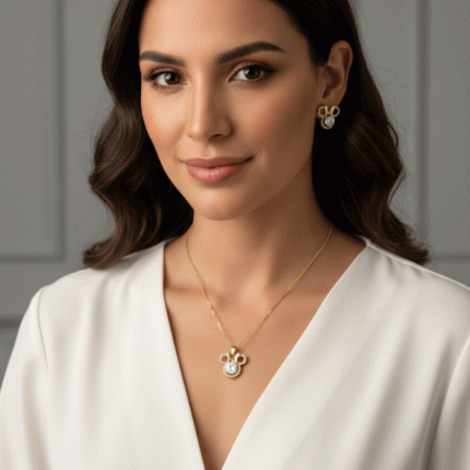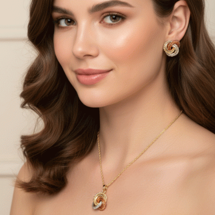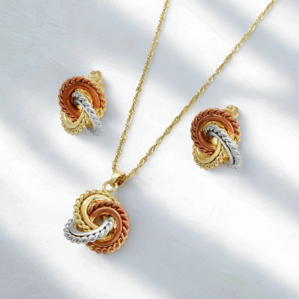 Juego de cadena, dije y aretes bañados en oro con diseño de lazo y circones brillantes. Un detalle femenino y elegante para resaltar tu estilo.