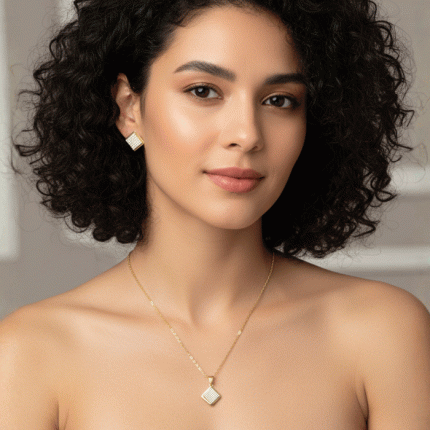 Juego de cadena, dije y aretes bañados en oro con diseño cuadrado de circones brillantes. Elegancia pura en cada detalle.