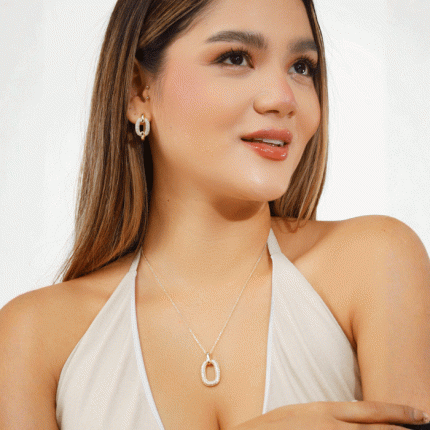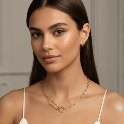 Juego de cadena, dije y argollas bañados en oro con diseño de eslabones brillantes. Elegancia moderna que simboliza conexión y estilo.