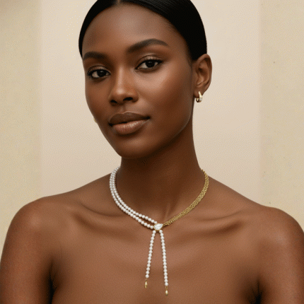 Juego de collar de perlas y argollas Huggies bañados en oro. Un equilibrio perfecto entre elegancia clásica y brillo moderno.