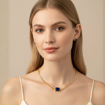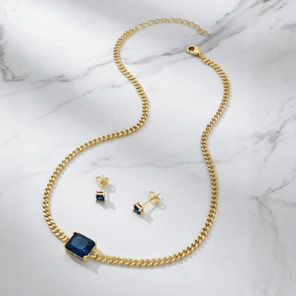 Juego de collar y aretes bañados en oro con cristales azul zafiro. Una joya elegante que destaca por su brillo y distinción.