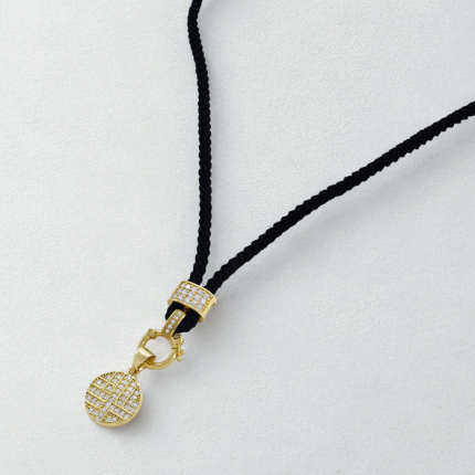 Collar con cordón negro y dije dorado con circones. Una joya moderna que combina fuerza, brillo y elegancia.