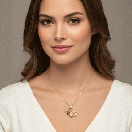 Cadena bañada en oro con dijes frutales y piedra roja. Una joya alegre y elegante para brillar todos los días.