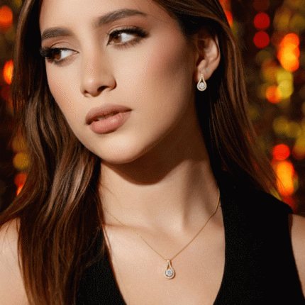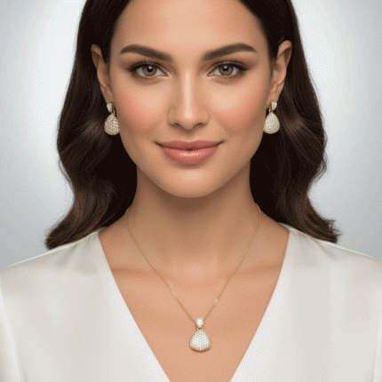 Juego de cadena y aretes en forma de lágrima con incrustaciones de circones, bañados en oro de alta calidad. Un conjunto clásico y radiante para toda ocasión.