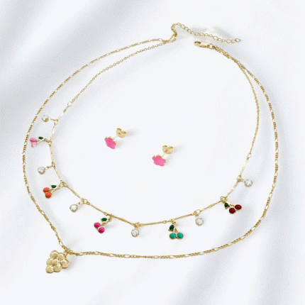 Juego de collar doble con dijes frutales esmaltados y aretes en forma de nube, bañado en oro. Alegre, delicado y sofisticado.