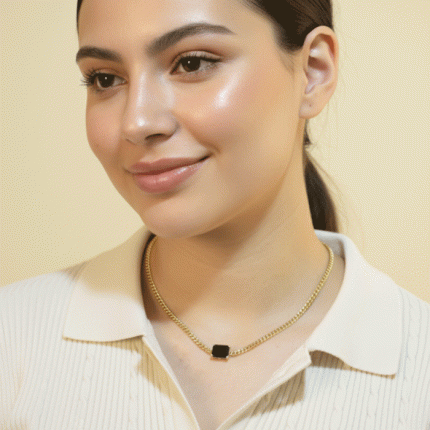 Collar bañado en oro con dije negro cuadrado, un accesorio minimalista y sofisticado que combina elegancia y modernidad.