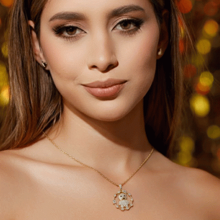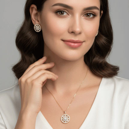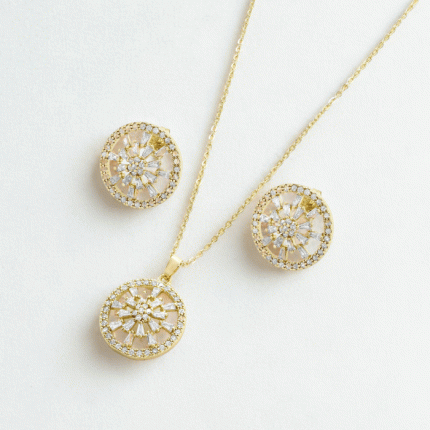 Juego de cadena, dije y aretes bañados en oro con diseño circular de circones brillantes, símbolo de elegancia y estilo.