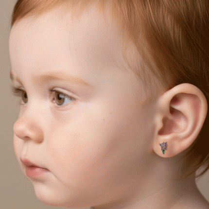 Aretes ortopédicos para bebé bañados en oro, con diseño de racimo de uvas y zircones. Seguros, cómodos y delicados.