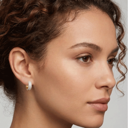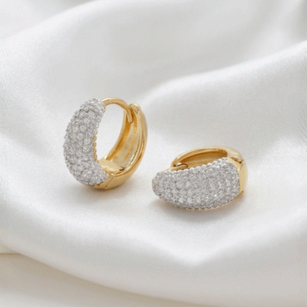 Eleva tu estilo diario con estas sofisticadas argollas tipo "Huggies". Bañadas en oro de 18K y recubiertas con un deslumbrante pavé de micro-circones, ofrecen un ajuste cómodo y un brillo excepcional que captura la luz desde cualquier ángulo.
