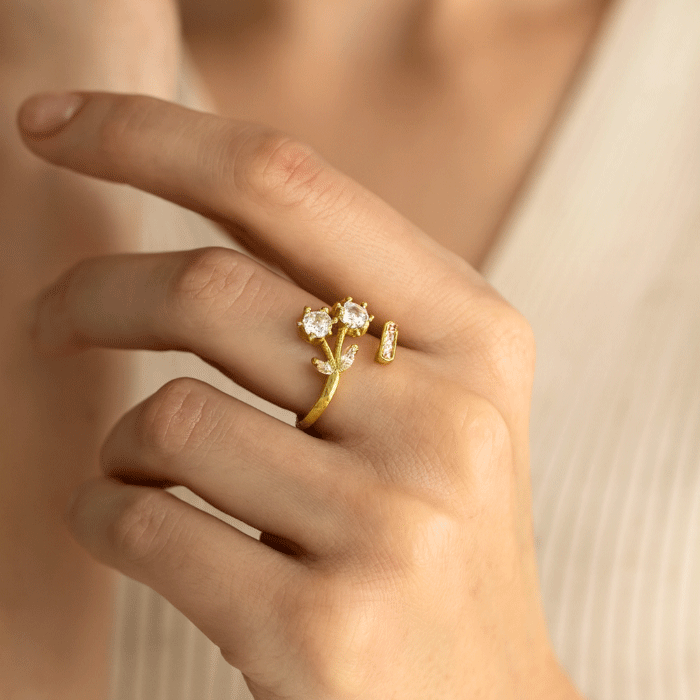Descubre la elegancia atemporal con nuestro anillo ajustable bañado en oro, diseñado para realzar cada momento especial. Su diseño abierto combina la delicadeza de dos circones centrales con pequeños detalles en forma de hojas y un elegante acabado de micro circones incrustados en el aro.