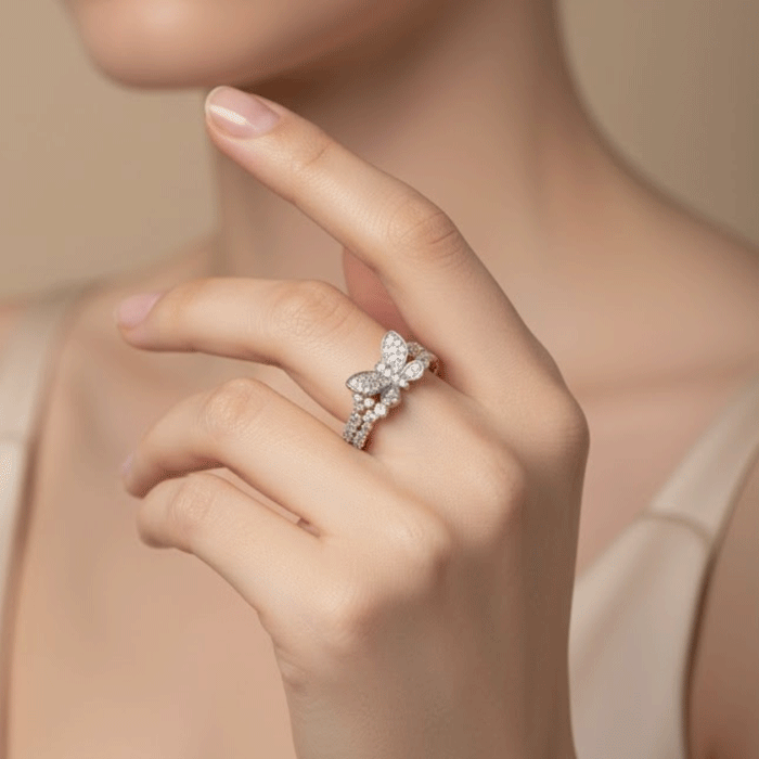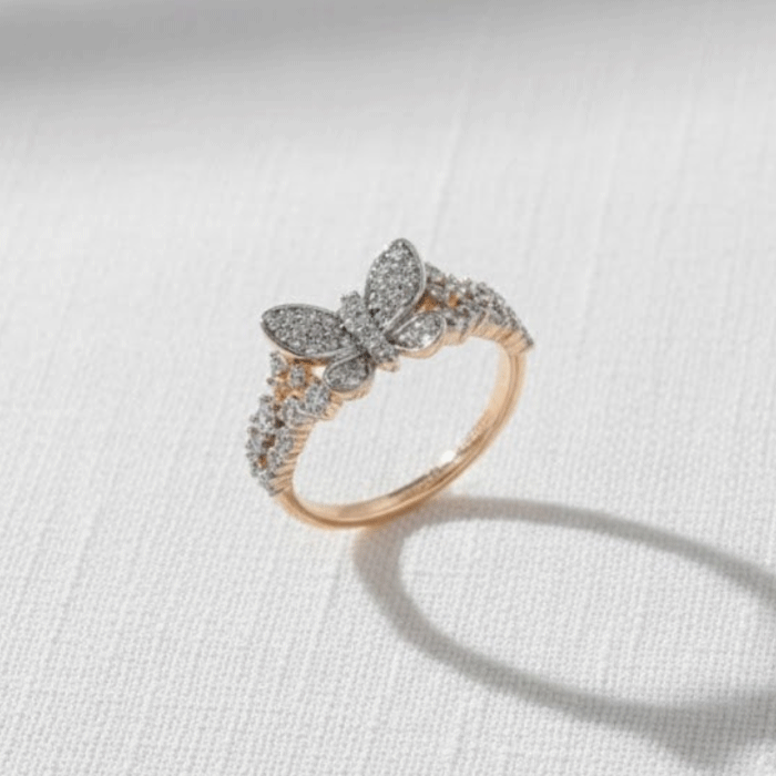 Este hermoso anillo destaca por su delicada mariposa central, completamente recubierta con circones brillantes que aportan un efecto luminoso y encantador. La pieza está bañada en Oro Italiano de 24KT, creando un contraste cálido y elegante con el detalle superior en Oro Blanco, donde los circones resaltan con intensidad.