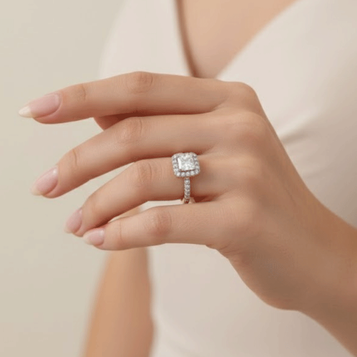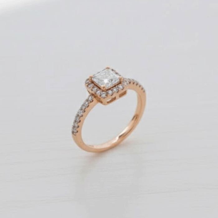 Anillo halo con circón corte princesa, bañado en Oro Italiano 24KT y detalle en Oro Blanco. Elegante, brillante y perfecto para momentos especiales.