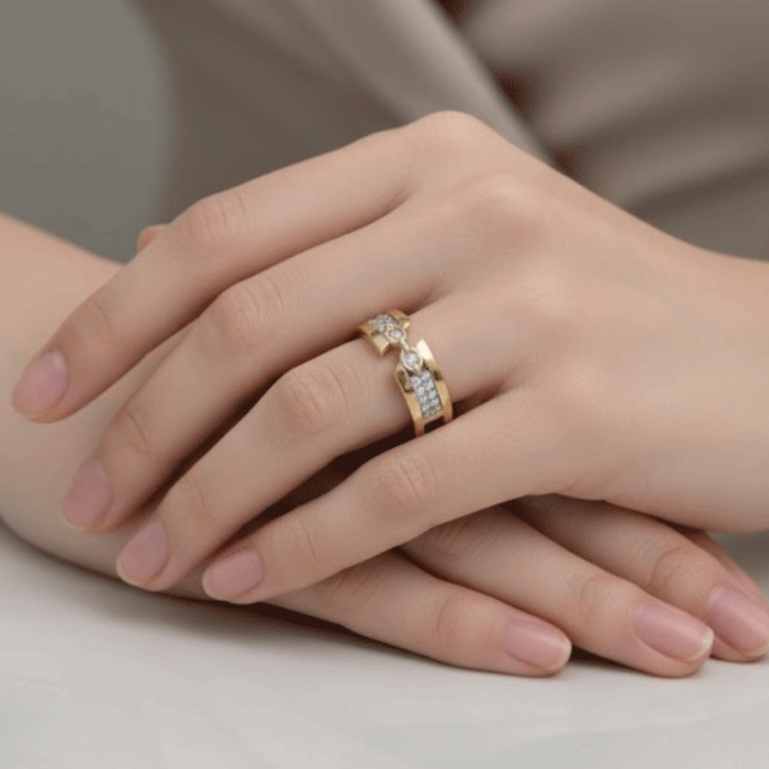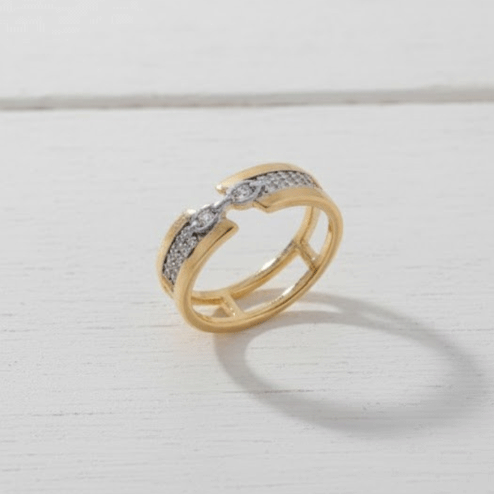 Este anillo destaca por su diseño abierto y moderno, ideal para mujeres que buscan elegancia con un toque contemporáneo. Está finamente bañado en Oro Italiano de 24KT, acompañado de un delicado contraste en Oro Blanco, donde se engastan circones brillantes que recorren suavemente la parte superior del diseño.