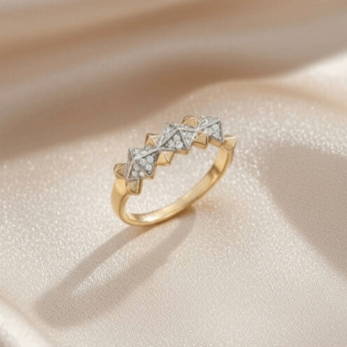 Este anillo presenta un diseño único compuesto por pequeñas figuras geométricas en forma de pirámides, cada una realzada con circones brillantes que aportan un destello elegante y moderno. Su estructura está bañada en Oro Italiano de 24KT, mientras que la parte superior incorpora un delicado baño de Oro Blanco para potenciar el contraste y brillo de cada piedra.