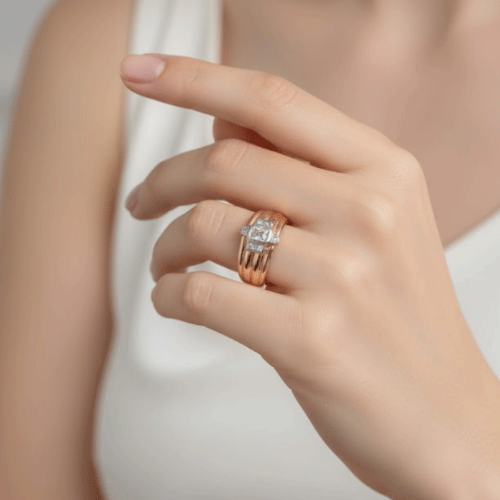 Este elegante anillo presenta un diseño moderno con un centro cuadrado tipo halo, adornado con un circón principal y pequeños circones alrededor que añaden brillo y sutileza. La pieza está cuidadosamente bañada en Oro Italiano de 24KT, aportando un color cálido y distinguido, mientras que el detalle superior en Oro Blanco realza el contraste y la luminosidad de las piedras.