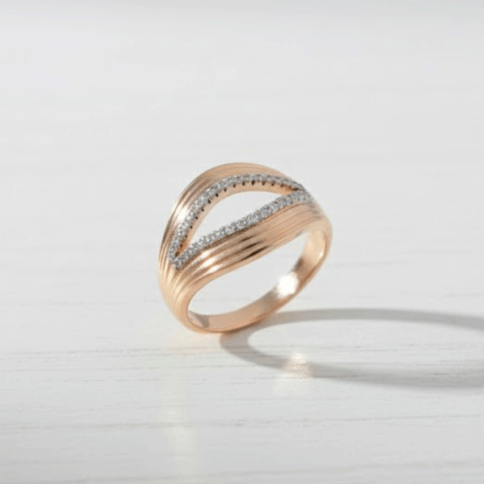 Anillo con diseño ondulado texturizado en Oro Italiano 24KT, línea de circones y detalle en Oro Blanco. Femenino, moderno y muy elegante.
