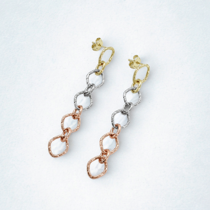 Aretes largos bañados en 3 oros con diseño de cadenas entrelazadas. Elegancia, versatilidad y brillo en una sola joya.