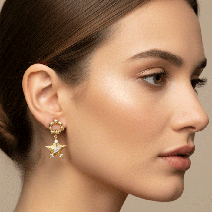 Estos exquisitos aretes colgantes para dama combinan la calidez del baño de oro con un diseño estelar moderno y sofisticado. Cada arete presenta un círculo superior con textura de pequeñas esferas, del cual cuelga una cautivadora estrella de cinco puntas.
