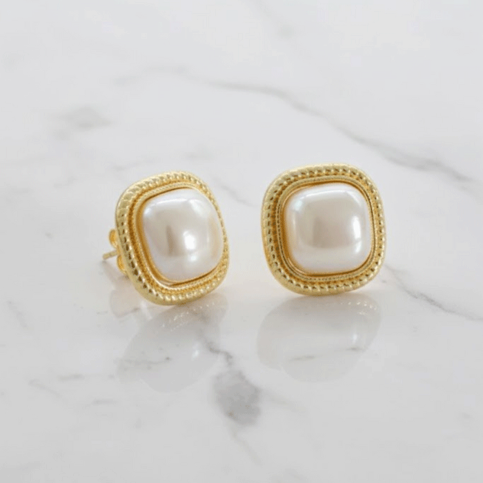 Aretes cuadrados bañados en oro con perla central. Diseño elegante, femenino y moderno con borde texturizado.