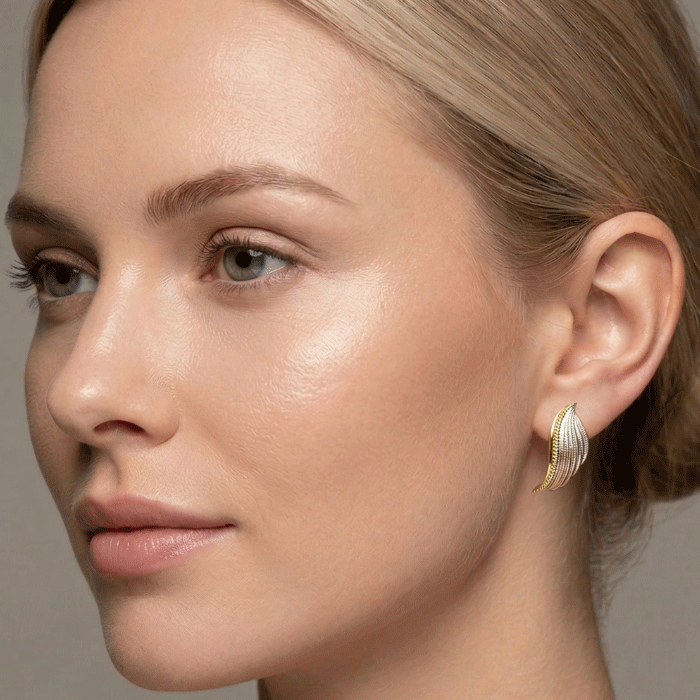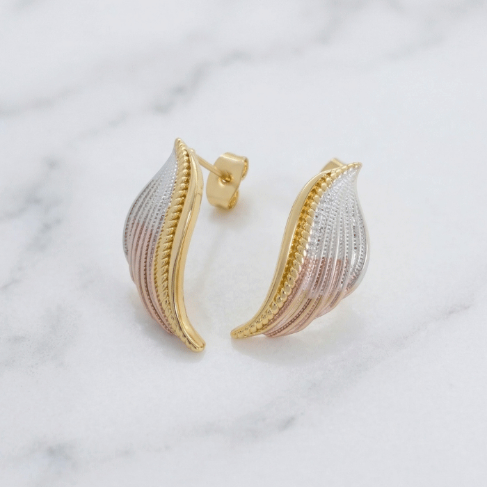 Elegantes aretes con un cautivador diseño en forma de ala, elaborados con un impecable baño de oro y detalles en tonos tricolor (oro amarillo, oro rosa y plata). Su estructura presenta un delicado grabado de plumas que aporta textura y movimiento, mientras que el borde perlado en oro amarillo define una silueta sofisticada y moderna.