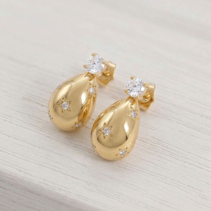 Aretes tipo gota con baño de oro y detalles de estrellas incrustadas con microcircones. Un diseño versátil y elegante con acabado de lujo, ideal para iluminar el rostro a diario.