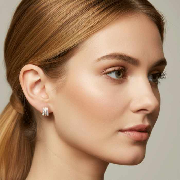 Maestría italiana en cada detalle. Nuestros aretes de 24K son una oda a la sofisticación moderna. El diseño destaca por su estructura de tres franjas: un centro de oro italiano con textura labrada que aporta carácter, rodeado por dos hileras de oro blanco engastadas con micro-circones que capturan la luz de manera sublime.