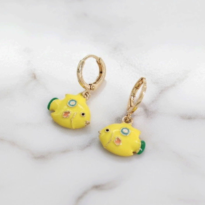 Aretes de pececitos amarillos esmaltados con baño de oro. Ligeros, divertidos y llenos de color, ideales para looks juveniles y frescos.