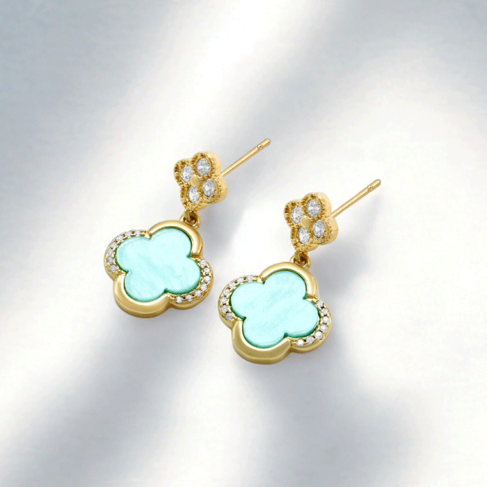 Aretes bañados en oro con diseño de trébol turquesa y circones brillantes, ideales para un look fresco, moderno y elegante.