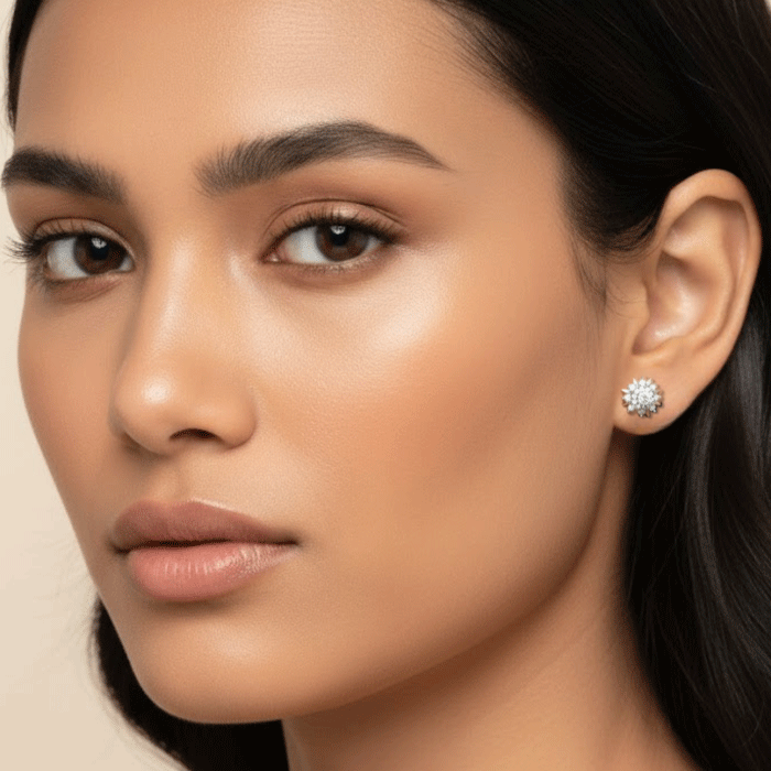Los Aretes Flor Brillante combinan la delicadeza del diseño floral con el lujo del Oro Italiano de 24KT y el resplandor del Baño en Oro Blanco, creando una pieza radiante y sofisticada.