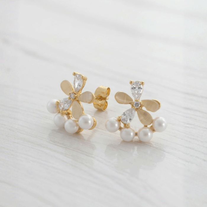Eleva tu estilo con la delicadeza de la naturaleza. Estos aretes de diseño floral combinan el brillo del oro con la pureza de las perlas blancas y la sofisticación de cristales en corte gota.