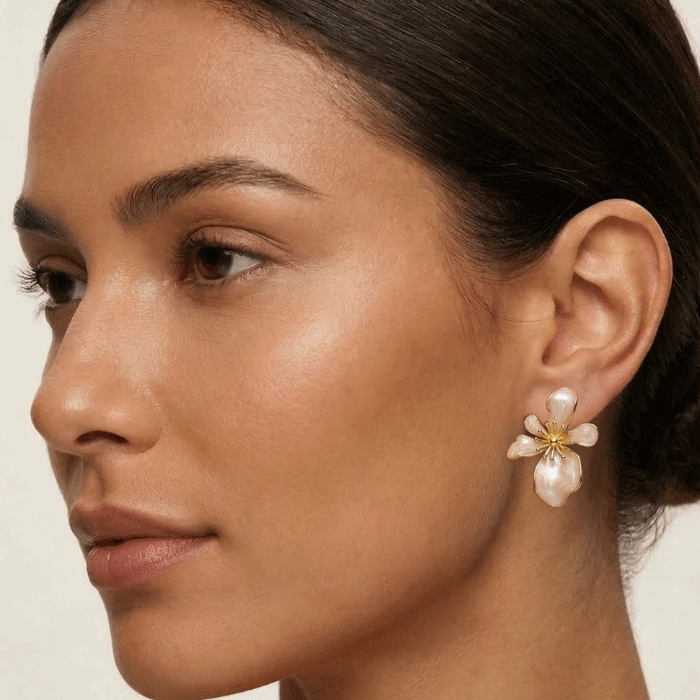 Eleva tu estilo diario con estos exclusivos aretes de diseño floral. Confeccionados con un delicado acabado en baño de oro y pétalos esmaltados en un tono nude con efecto marmoleado.