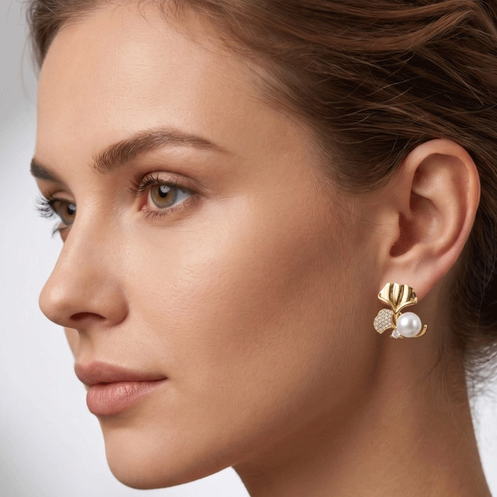 Aretes Ginkgo Elegancia Natural Bañados en Oro con Perlas y Circones