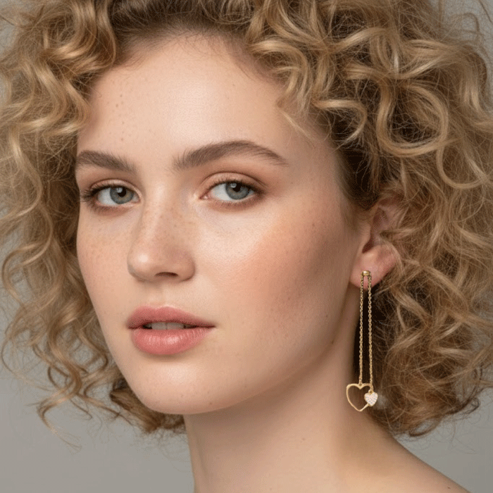 Celebra el amor y la elegancia con estos encantadores Aretes Largos Bañados en Oro, diseñados con dos corazones colgantes que se balancean delicadamente en finas cadenas doradas. El corazón principal presenta un diseño abierto y moderno, mientras que el corazón pequeño está cuidadosamente adornado con circones brillantes que aportan un toque de luz y sofisticación.