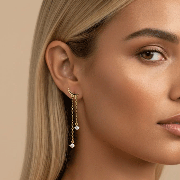 Ilumina tu look con estos delicados Aretes Largos Bañados en Oro, diseñados con una hermosa luna minimalista que sostiene finas cadenas doradas adornadas con circones brillantes. Su caída elegante y movimiento sutil hacen que destaquen en cada paso, aportando un toque moderno, romántico y sofisticado.