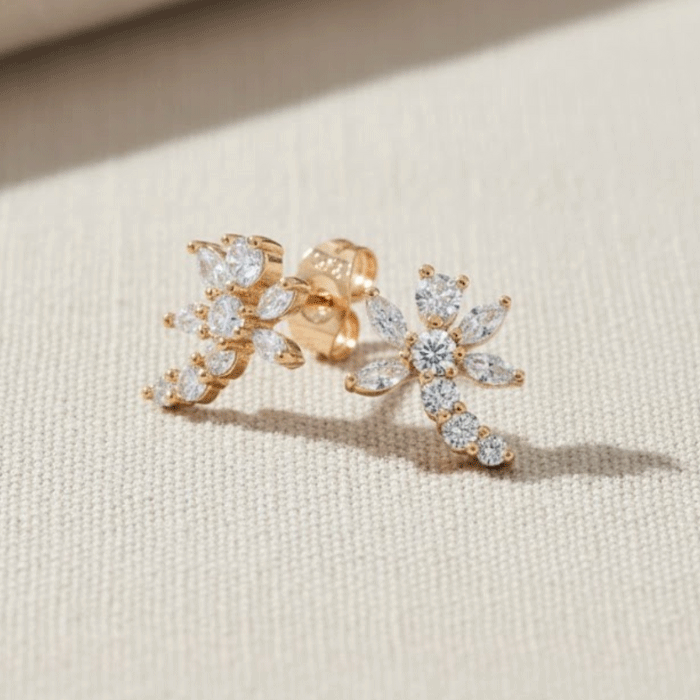Aretes en forma de libélula con circones brillantes, bañados en Oro Italiano 24KT y Oro Blanco. Delicados, luminosos y llenos de significado.