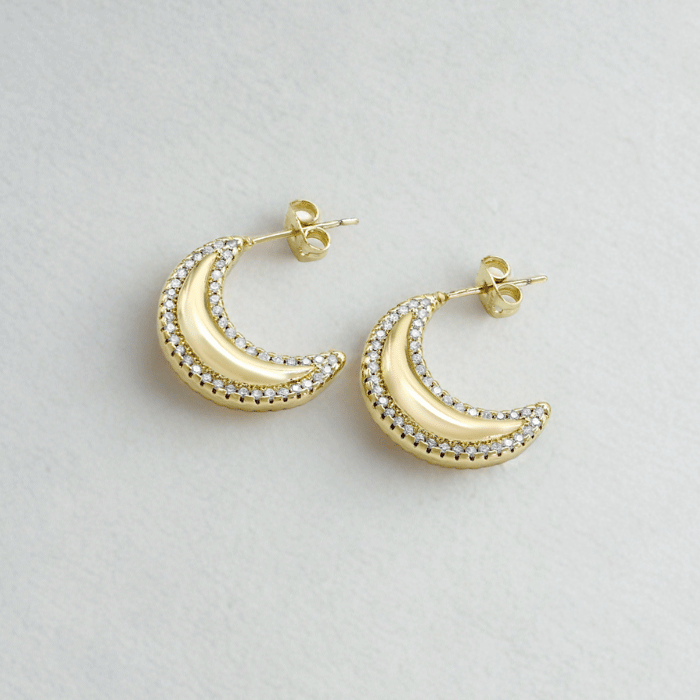 Aretes de luna bañados en oro, adornados con circones brillantes que iluminan tu estilo con un encanto celestial.