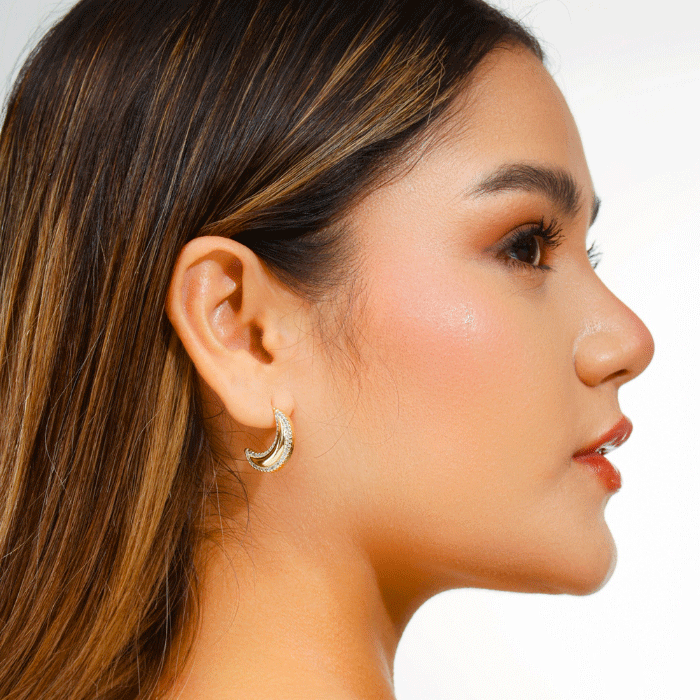 Estos aretes en forma de media luna bañados en oro destacan por su diseño celestial y elegante de 2cm de alto. Cada pieza está cuidadosamente rodeada de micro circones blancas que realzan el brillo del oro, creando un contraste sofisticado y delicado.