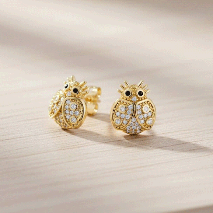 Encantadores aretes tipo topo en forma de mariquitas de 1.1cm de alto, bañados en oro y cuidadosamente decorados con circones brillantes que capturan la luz en cada movimiento.