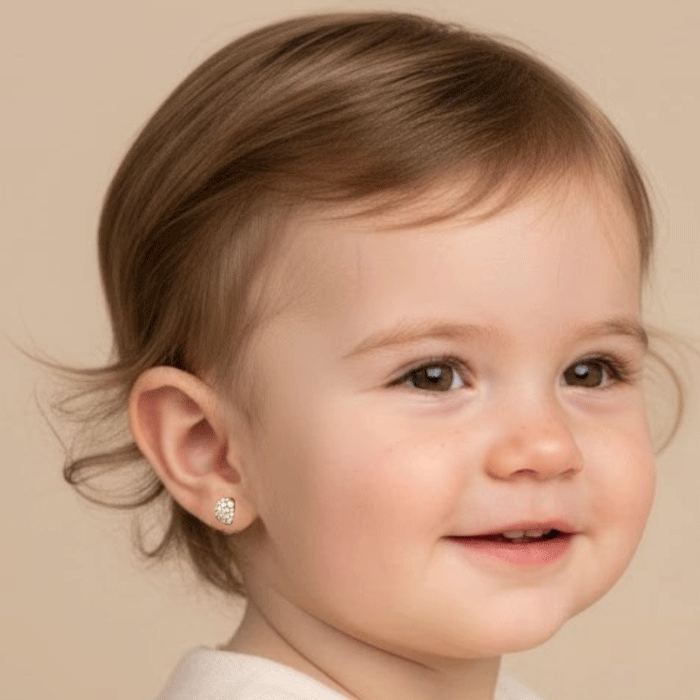 Estos delicados Aretes Ortopédicos bañados en oro están diseñados especialmente para realzar la ternura de los bebés con un brillo suave y elegante. Su forma redondeada y pulida se combina con un detalle pavé de circones blancos, creando un acabado luminoso que destaca sin perder sutileza.