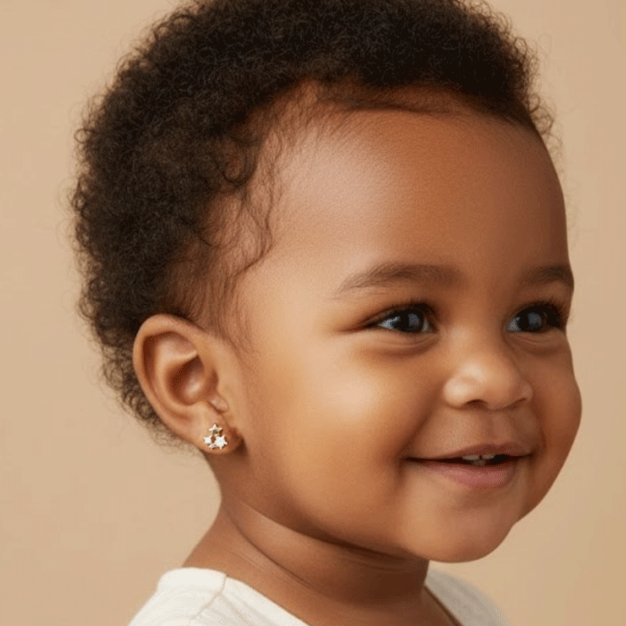 Ilumina los primeros momentos de tu pequeña con estos encantadores Aretes Ortopédicos en forma de estrellas, diseñados especialmente para bebés. Cada pieza combina una tierna estrella bañada en oro con un delicado conjunto de circones blancos brillantes, creando un efecto luminoso que resalta con cada movimiento.