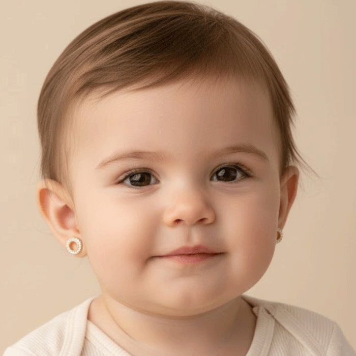 Estos delicados aretes ortopédicos para bebé bañados en oro ofrecen un diseño clásico y encantador en forma de mini aro circular, adornado con microcircones que aportan un brillo suave y elegante. Su estilo minimalista es perfecto para resaltar la ternura natural de las más pequeñas sin perder el toque moderno que toda mamá ama.